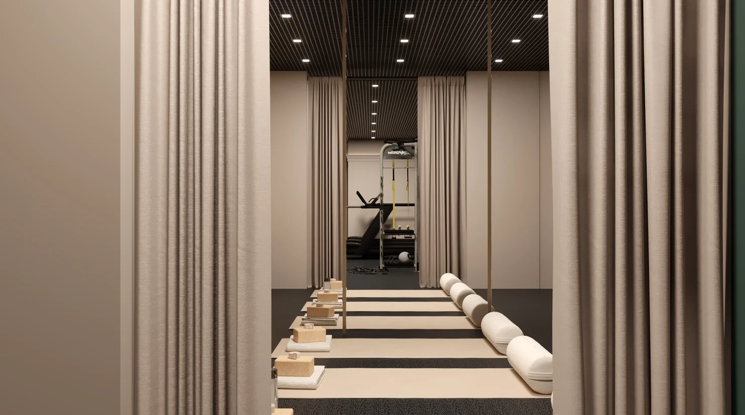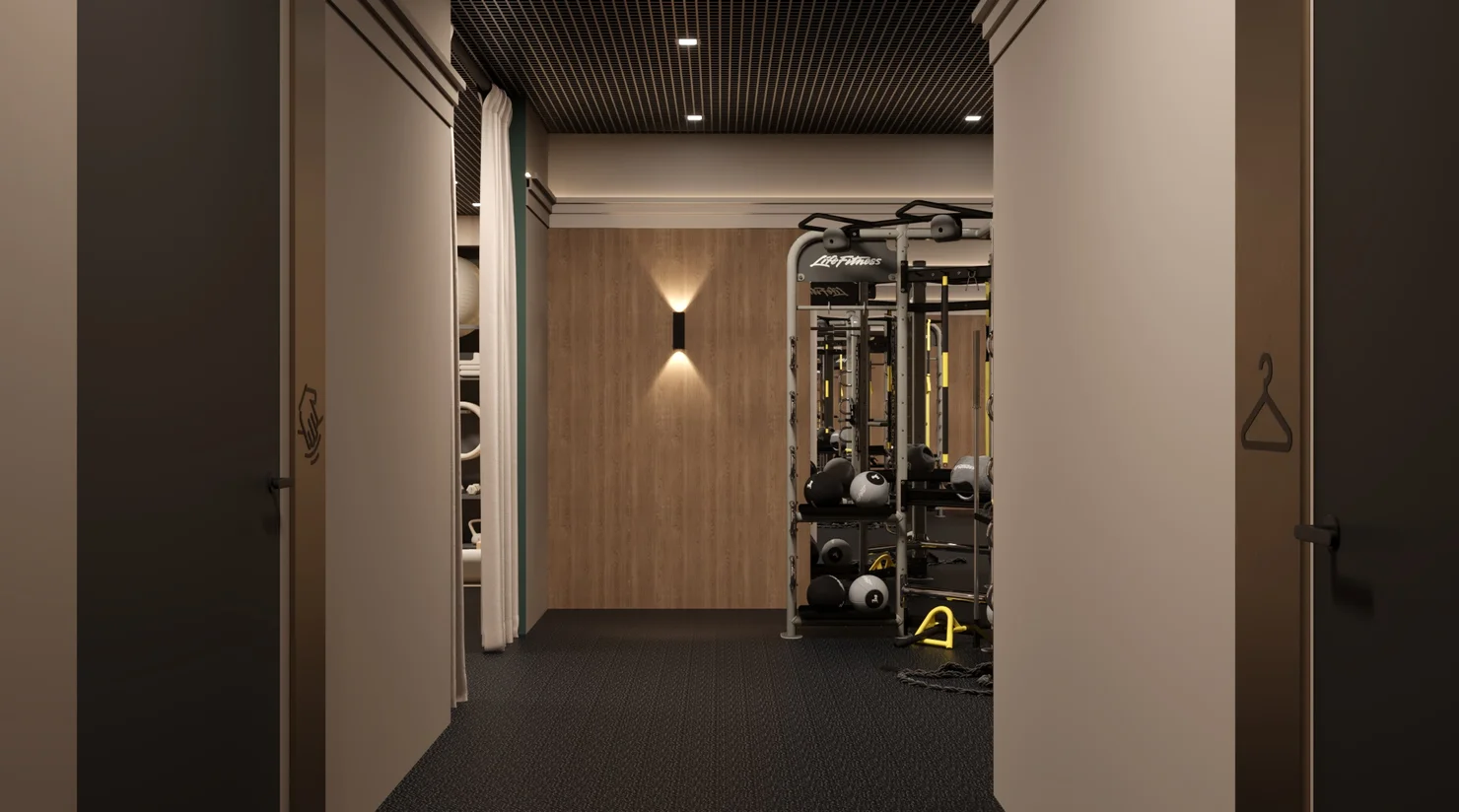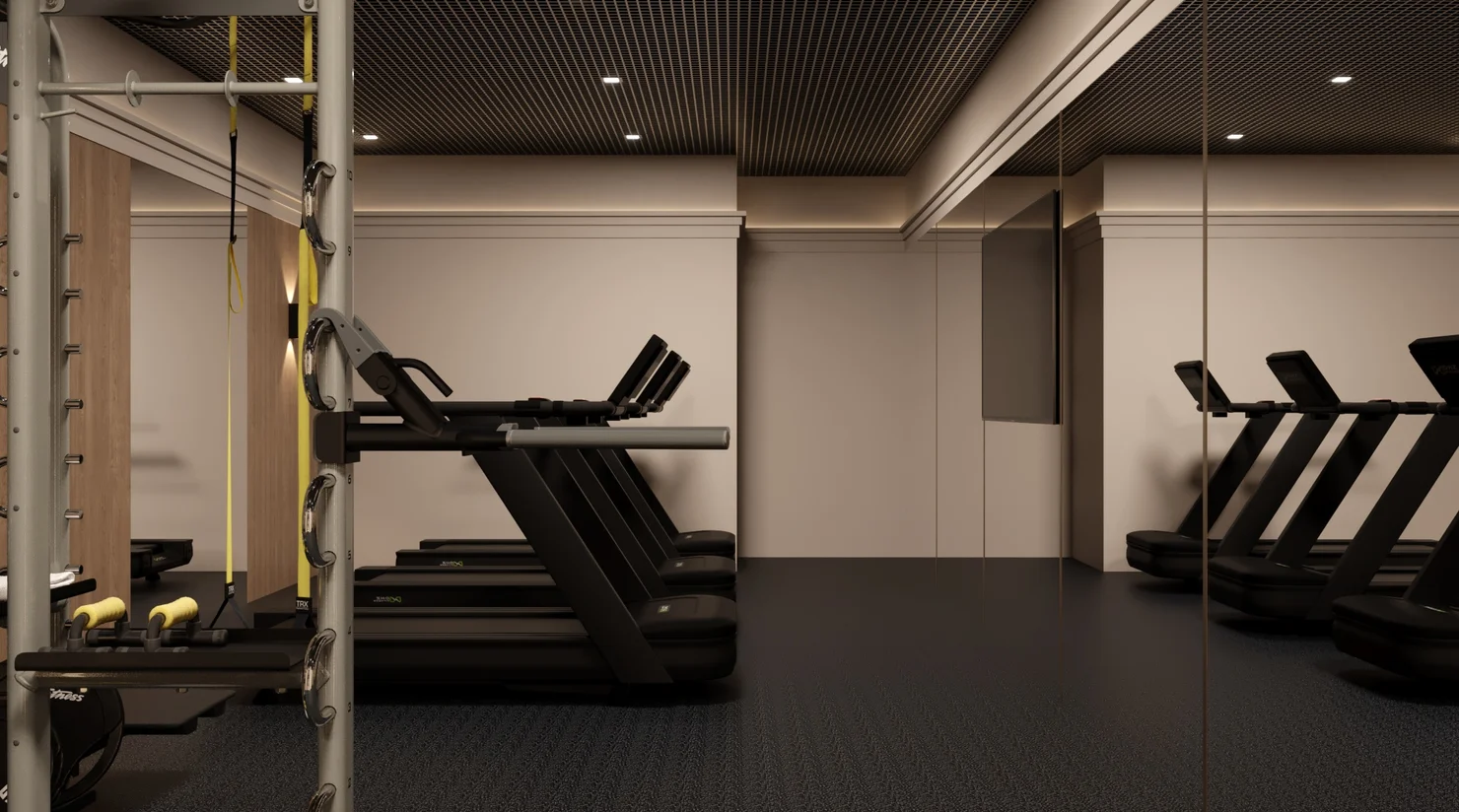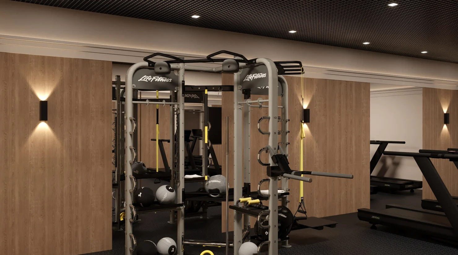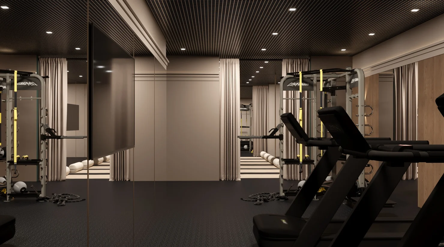 Эргономичное пространство для занятий с персональным тренером, индивидуальных практик йоги в удобное время или несколько километров на велотренажере, беговой дорожке или эллипсоиде.