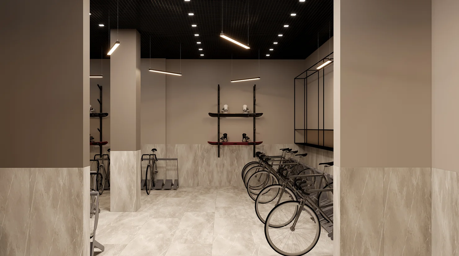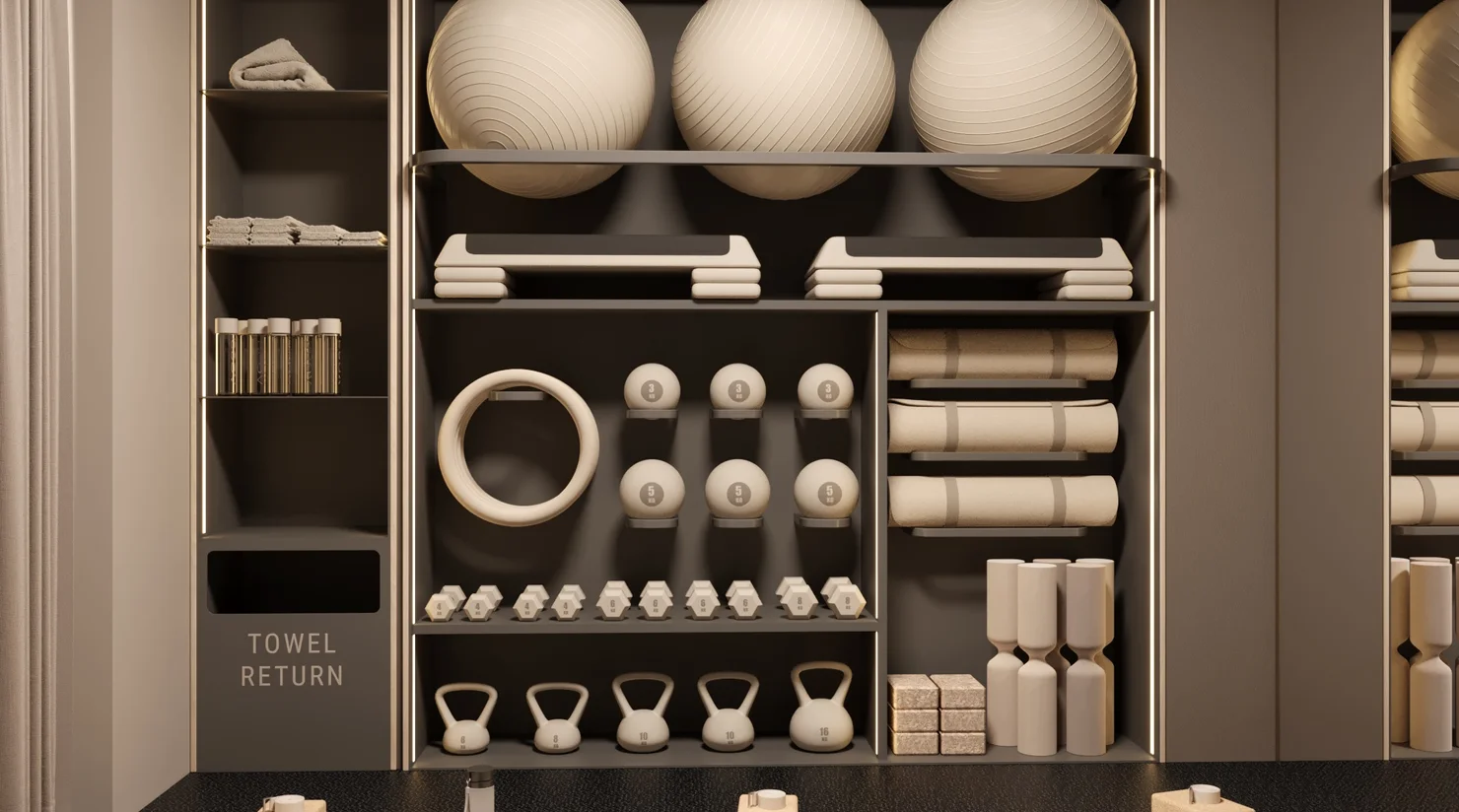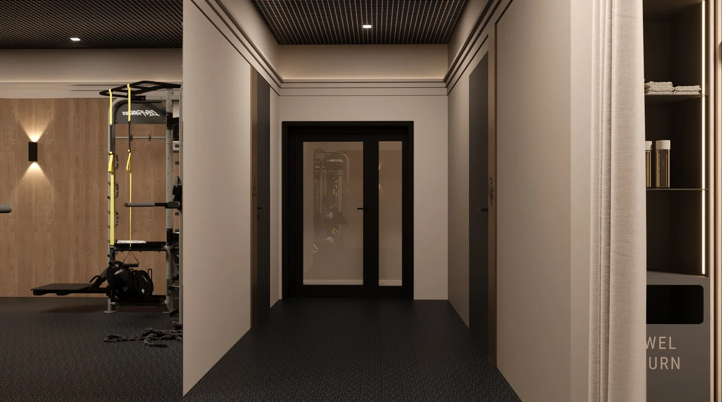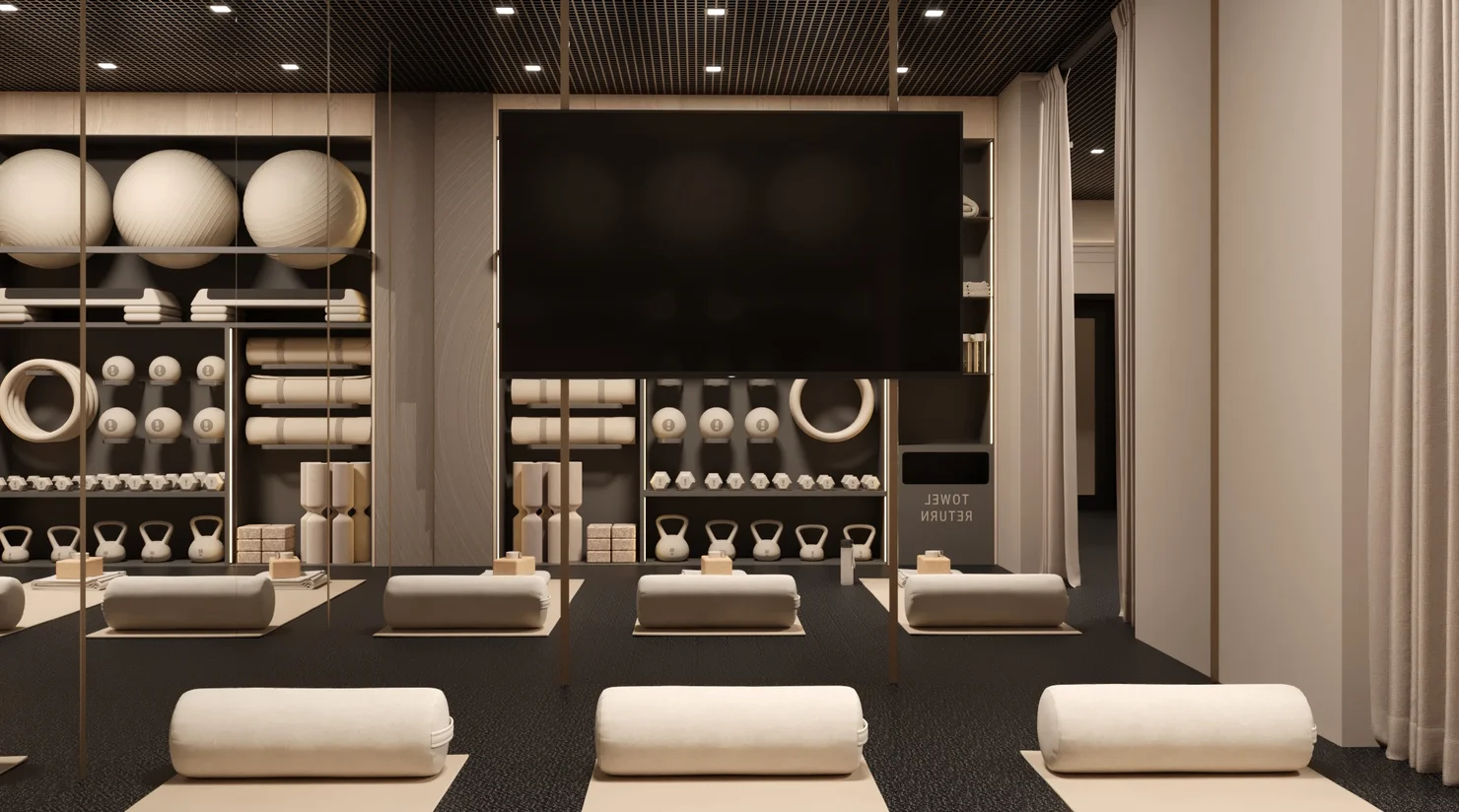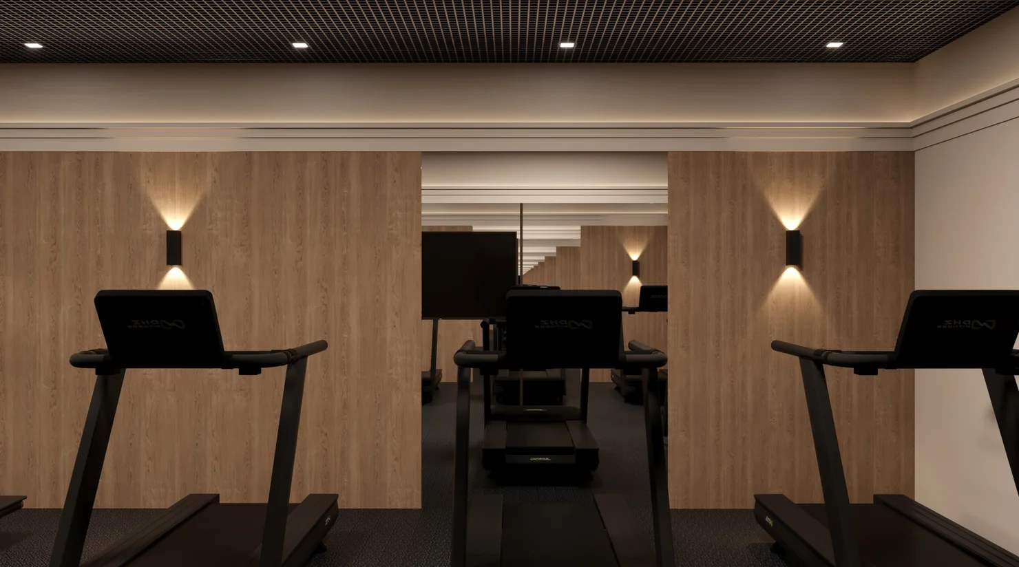 Эргономичное пространство для занятий с персональным тренером, индивидуальных практик йоги в удобное время или несколько километров на велотренажере, беговой дорожке или эллипсоиде.